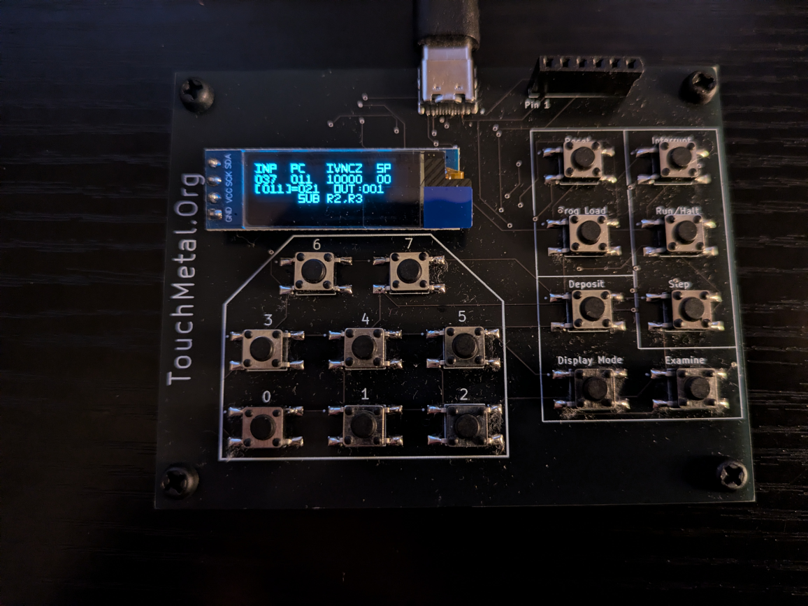 This is a picture of a Touch Metal board. Power is supplied through a USB-C connector at the top. The 4x20 LCD display gives information as you work with the board. The display can also be magnified (by using the "Display Mode" button), showing less information in a larger font. Inputs/commands are entered through the 16 pushbuttons. The 8 on the left let you enter octal (base 8) numbers. The buttons on the right let you examine and change memory, step the CPU, put the CPU in free-running mode, and so on.